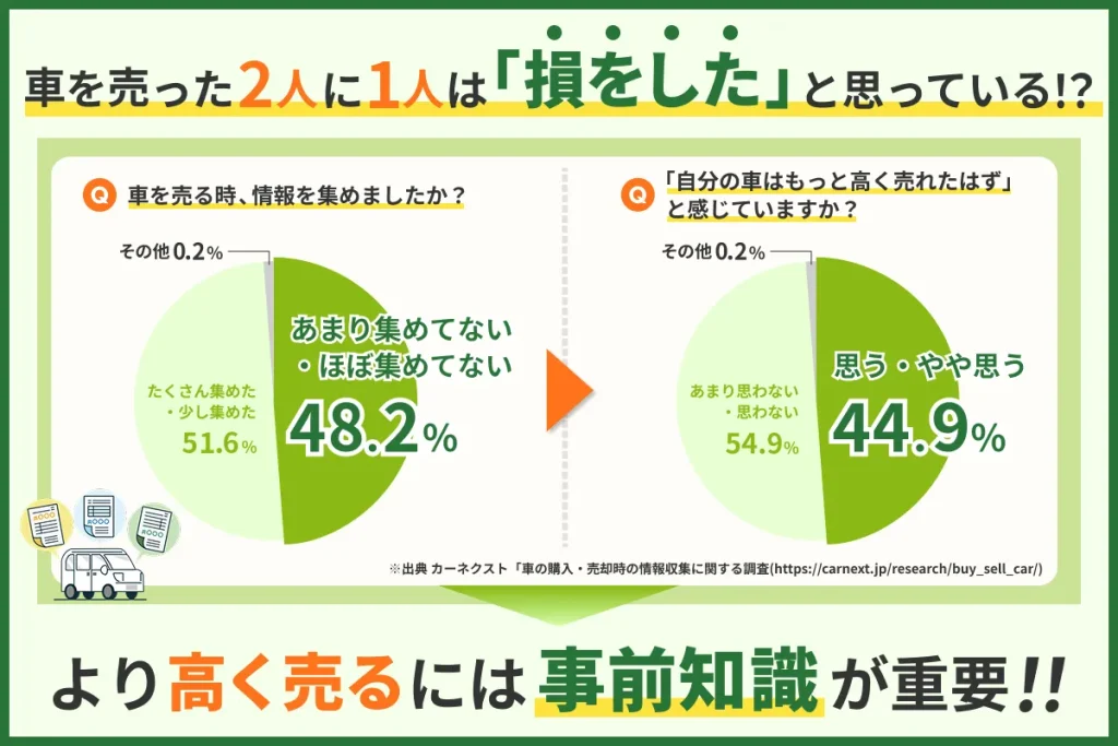 これは、既に売ってしまった車の本来の相場を後から知って「もっとしっかり情報収集していれば、本当はもっと高く売れていたはずだった…」と後悔している人が、全体の半数近くもいるというデータです。